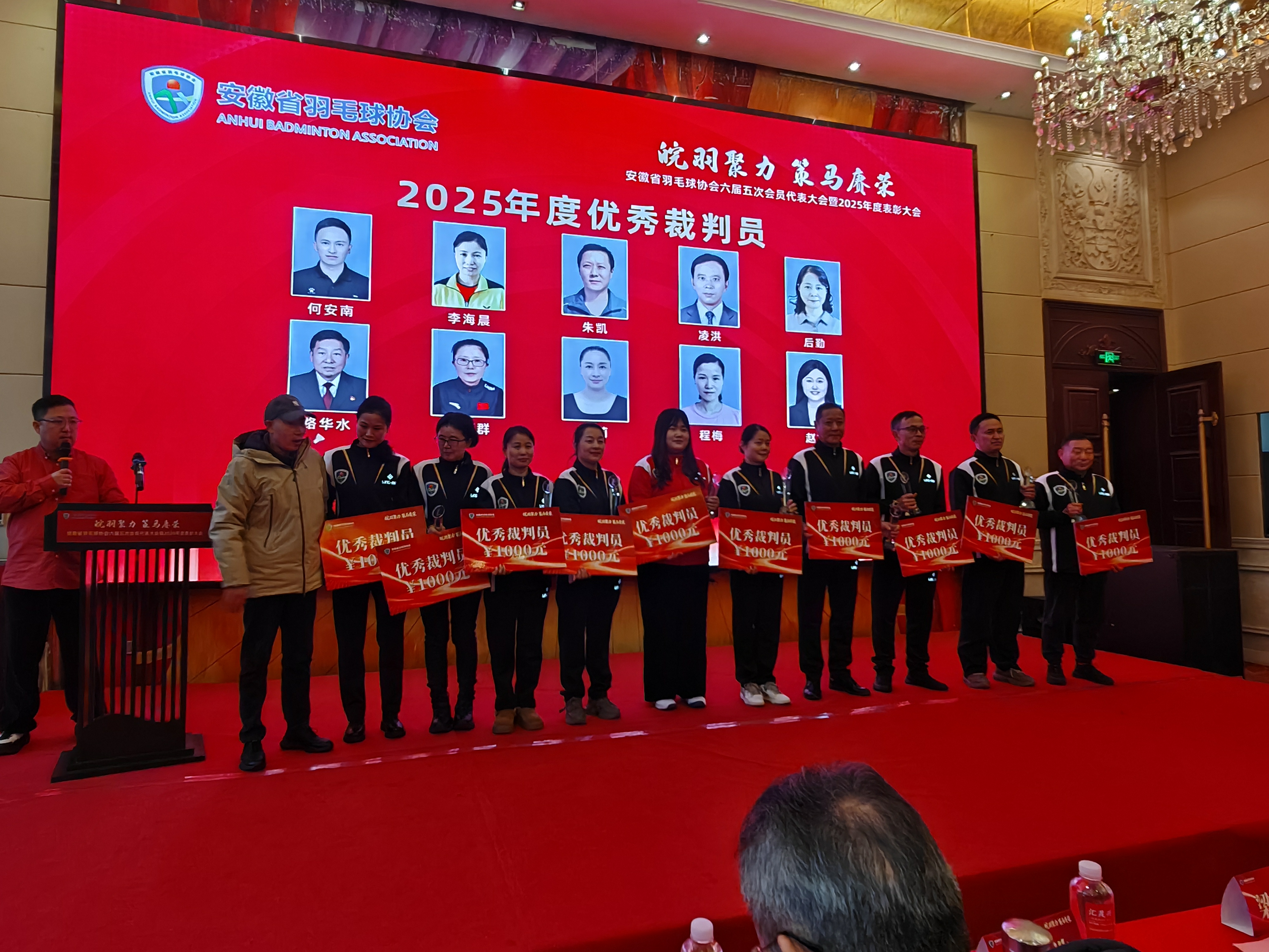 多年来,六安市羽协以党建为引领,积极投身公益事业,开展爱国教育、抗疫救灾、校园推广等各类活动;在组织建设上,实现县区羽协全覆盖,孵化40多家俱乐部,筑牢发展根基;在赛事推广上,每年主办、承办和协办各类赛事超50场,从“奥安康会长杯”到首届“羽林争霸”挑战赛,从市级联赛到省级赛事承办,赛事品牌影响力持续提升,每年参与赛事人数超千人,让羽毛球运动走进千家万户,成为六安全民健身的重要载体;在人才培养上,一方面搭建竞技平台,培育的3名选手成功登上全国运动会舞台,另一方面深耕裁判员梯队建设,定期举办裁判员培训班,邀请省内知名专家授课指导,不断提升裁判员专业素养,打造了一支执裁水平过硬、综合素质高的裁判队伍。此次大会上,六安市一级裁判员王莉女士凭借扎实的专业能力、严谨的执裁态度和良好的职业素养,被评为“2025年度安徽省优秀裁判员(十佳)”,这一荣誉不仅是王莉女士个人的光荣,更彰显了六安市在羽毛球裁判员梯队培训方面取得的长足进步,标志着我市羽球裁判队伍建设迈入高质量发展新阶段。