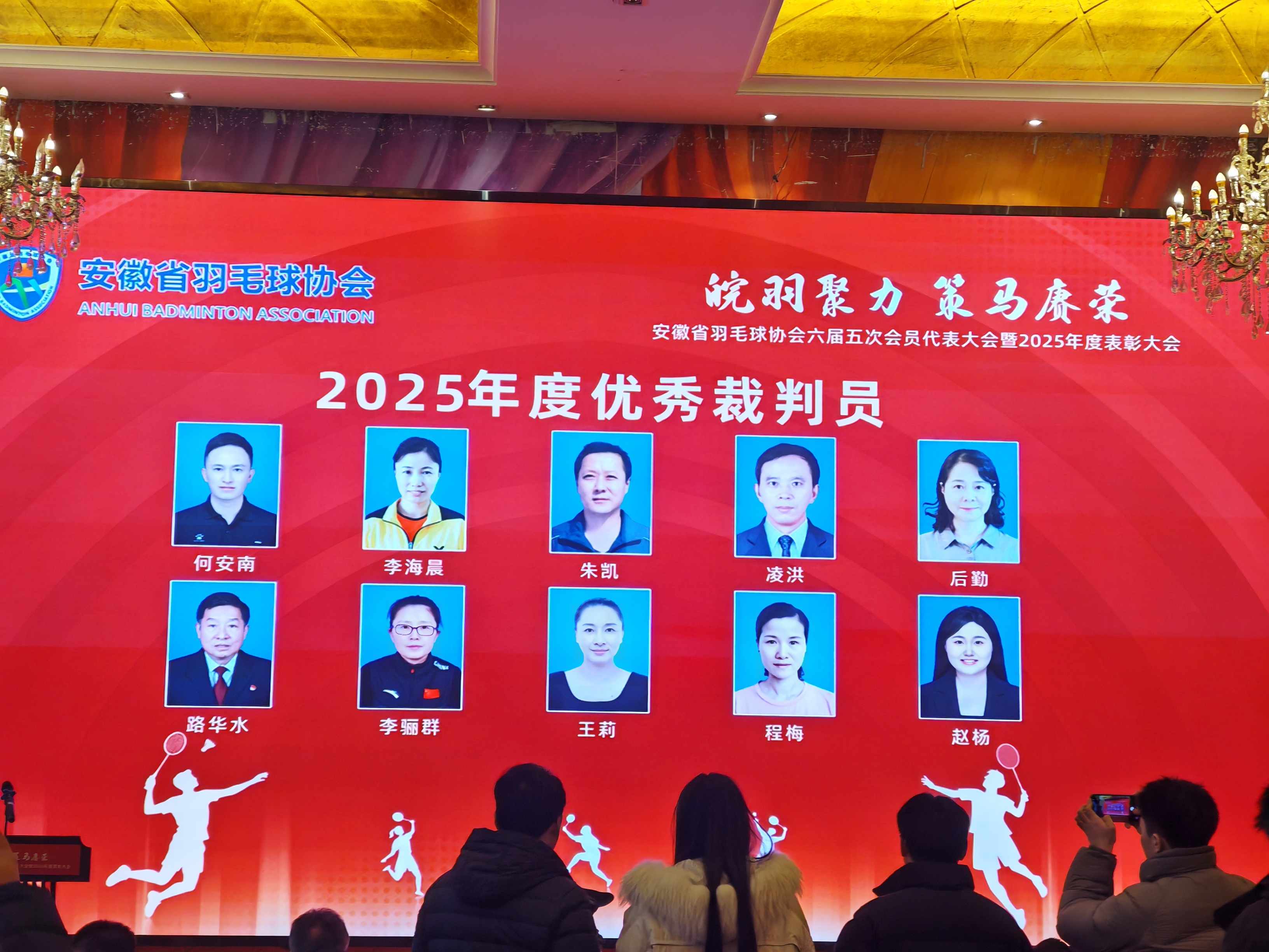 多年来,六安市羽协以党建为引领,积极投身公益事业,开展爱国教育、抗疫救灾、校园推广等各类活动;在组织建设上,实现县区羽协全覆盖,孵化40多家俱乐部,筑牢发展根基;在赛事推广上,每年主办、承办和协办各类赛事超50场,从“奥安康会长杯”到首届“羽林争霸”挑战赛,从市级联赛到省级赛事承办,赛事品牌影响力持续提升,每年参与赛事人数超千人,让羽毛球运动走进千家万户,成为六安全民健身的重要载体;在人才培养上,一方面搭建竞技平台,培育的3名选手成功登上全国运动会舞台,另一方面深耕裁判员梯队建设,定期举办裁判员培训班,邀请省内知名专家授课指导,不断提升裁判员专业素养,打造了一支执裁水平过硬、综合素质高的裁判队伍。此次大会上,六安市一级裁判员王莉女士凭借扎实的专业能力、严谨的执裁态度和良好的职业素养,被评为“2025年度安徽省优秀裁判员(十佳)”,这一荣誉不仅是王莉女士个人的光荣,更彰显了六安市在羽毛球裁判员梯队培训方面取得的长足进步,标志着我市羽球裁判队伍建设迈入高质量发展新阶段。